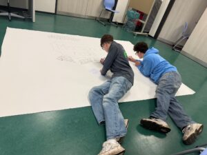Frau Röll vom AK Vielfalt hat anlässlich des Tags der Menschenrechte eine Plakataktion organisiert. Schülerinnen und Schüler unterschiedlicher Jahrgänge schrieben ihre Gedanken zu den Menschenrechten auf ein großes Plakat, das in der Halle F zu sehen sein wird.