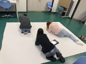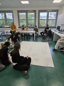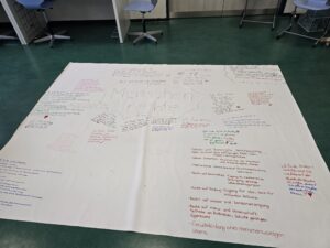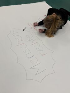 Frau Röll vom AK Vielfalt hat anlässlich des Tags der Menschenrechte eine Plakataktion organisiert. Schülerinnen und Schüler unterschiedlicher Jahrgänge schrieben ihre Gedanken zu den Menschenrechten auf ein großes Plakat, das in der Halle F zu sehen sein wird.