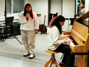 Dilan aus der 8B trug mit ihrer Saz in origineller und sehr rhythmischer Art das Lied „Elqqajiye“ von Mikail Aslan vor und sorgte so für eine besondere Atmosphäre. Danach begleitete Elisa auf dem Klavier den Gesang von Mina (beide 7F). In einem schwungvollen und energiegeladenen Vortrag präsentierten sie das Stück „Renn“ von Ayliva.