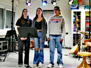 Die zuverlässigen und engagierten Tontechniker/innen waren: Josephine, Noah, Moritz (alle drei Q1) und Jonah, einer unserer ehemaligen Schüler. Besonders herauszustellen ist zudem das Engagement von Herrn Hattwig, der das Tontechnikerteam beriet und unterstützte sowie der besondere Einsatz derjenigen Tontechniker/innen, die sich diesmal extra am vorherigen Tag nach Schulschluss Zeit für den aufwendigen Aufbau genommen haben (diesmal mit Beleuchtungstraverse!) , und auch wieder mal die organisatorische Leistung von Moritz Reschop !